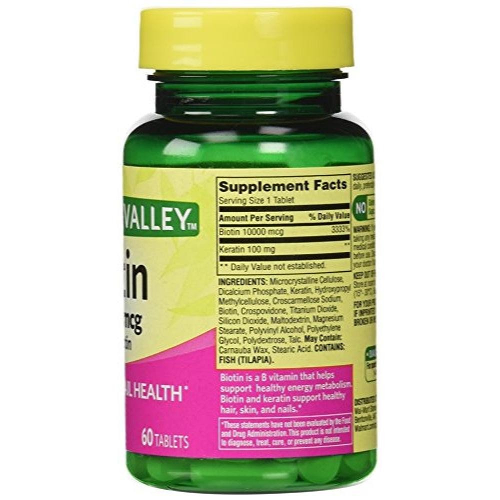 Spring Valley Biotin 10,000 Mcg le brinda apoyo nutricional de una importante vitamina B para el cabello, la piel y las uñas saludables. Al igual que todas las vitaminas B, la biotina contribuye a la salud del sistema nervioso y es esencial para el metabolismo energético: ayuda a convertir los alimentos Coma energía en el cuerpo