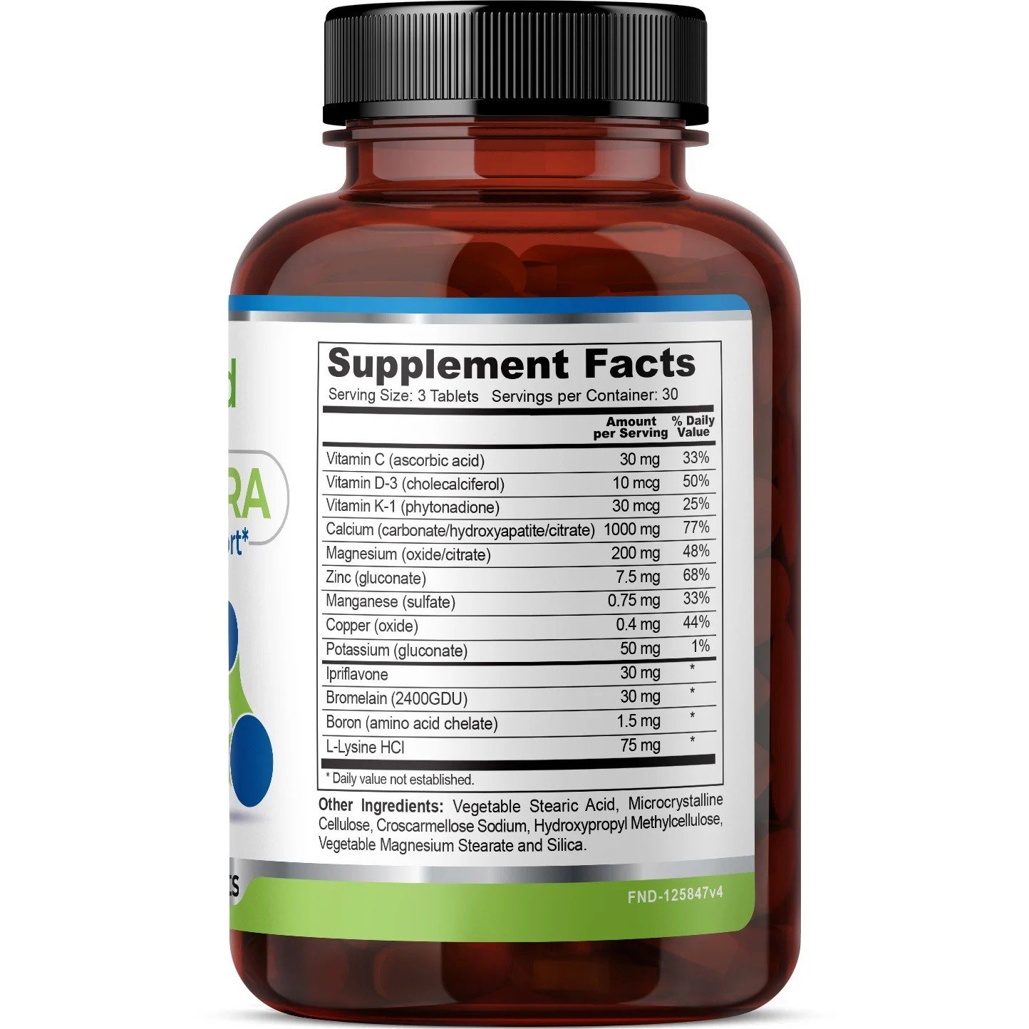 Vitamin C (ascorbic acid) 30 mg 50% Vitamin D-3 (cholecalciferol) 402 IU 100% Vitamin K-1 (phytonadione) 30 mcg 38% Calcium (carbonate/hydroxyapatite/citrate) 1000 mg 100% Magnesium (oxide/citrate) 200 mcg 50% Zinc