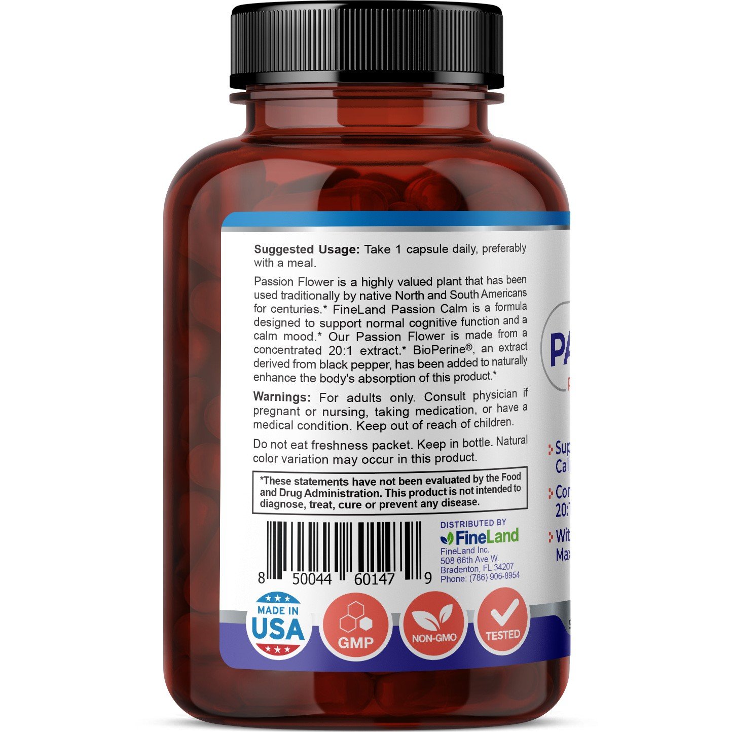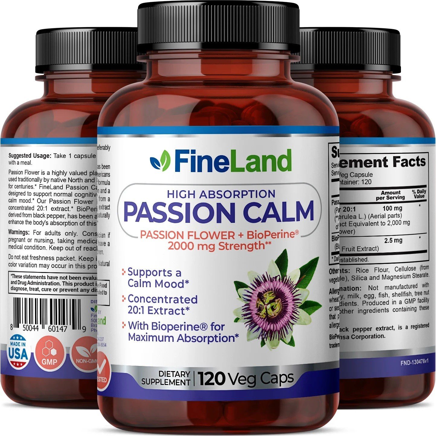La flor de la pasión (Passion Calm) es una planta muy valorada que ha sido utilizada tradicionalmente por los nativos de América del Norte y del Sur durante siglos.* FineLand Passion Calm es una fórmula diseñada para apoyar la función cognitiva normal y un estado de ánimo tranquilo.* Se ha agregado extracto derivado de la pimienta negra, para mejorar naturalmente la absorción de este producto por parte del cuerpo.*