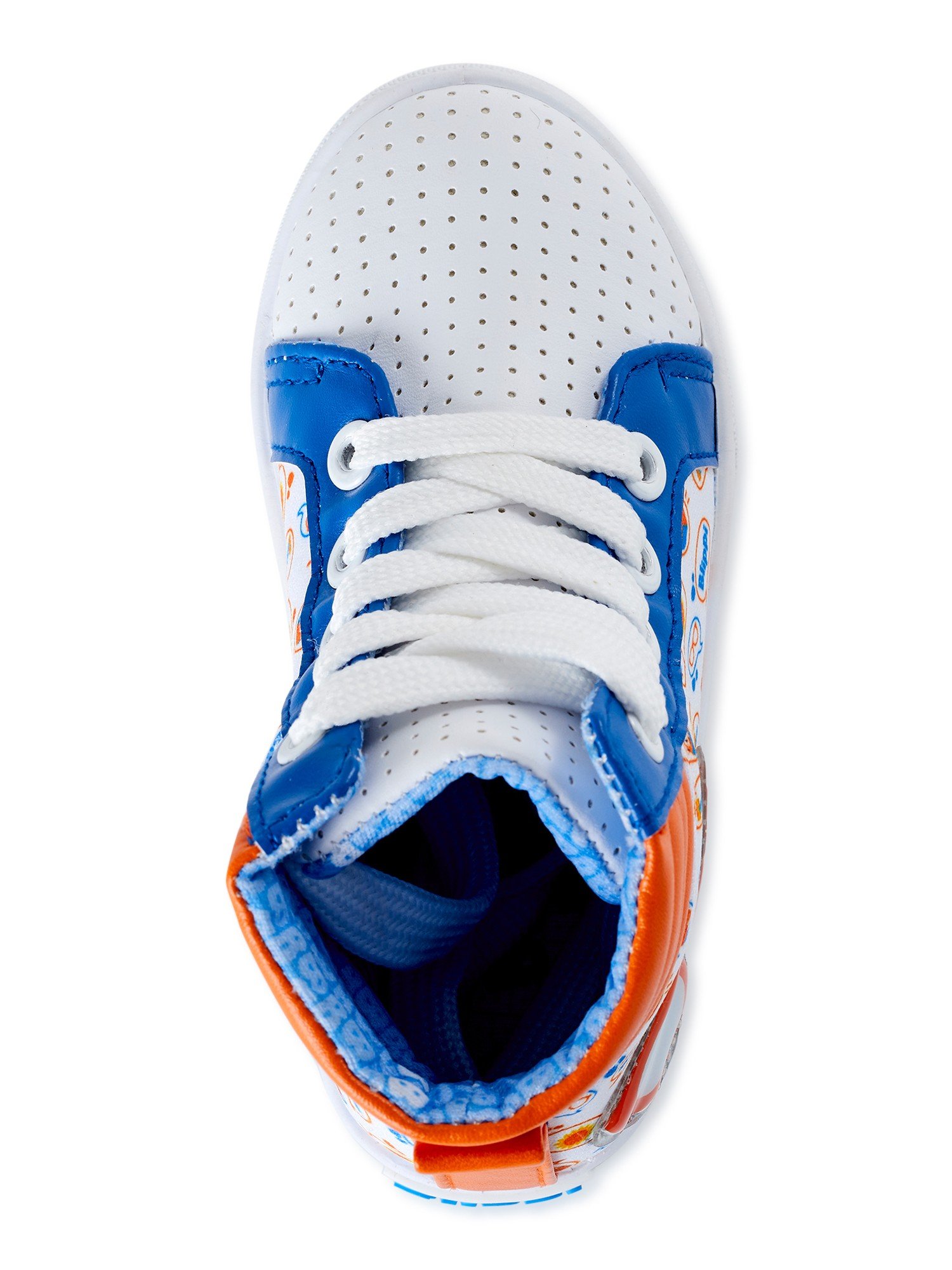 Los tenis de blippi, confeccionados con la exclusiva construcción de 3 piezas con puntera, presentan un collar forrado en malla de punto naranja, que proporciona un borde brillante alrededor de la plantilla y la lengüeta impresa con la carita sonriente de Blippi
