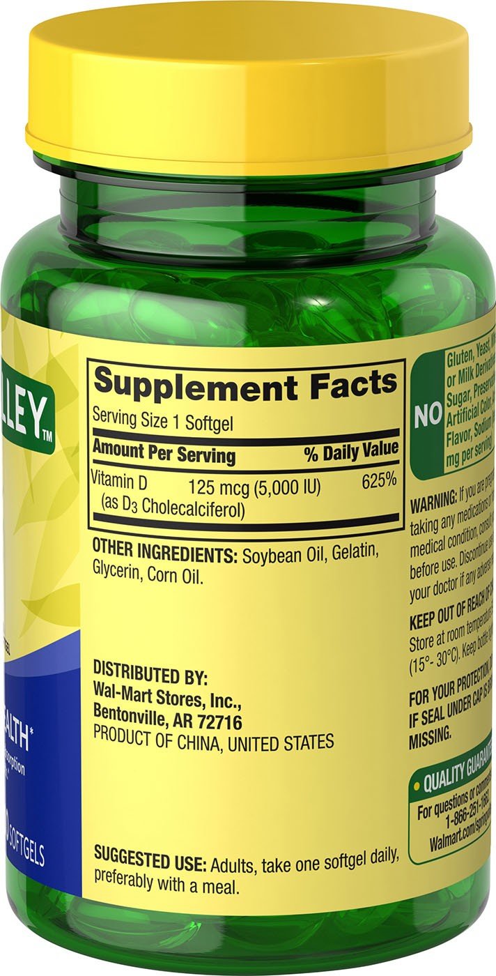 Las cápsulas blandas de vitamina D3 de Spring Valley son una fuente de alta potencia de la vitamina D que necesita todos los días. La vitamina D3 es una forma más potente y activa de la vitamina y es esencial y sirve para la absorción de calcio, huesos y dientes sanos y salud del sistema inmunológico. * El cuerpo humano puede producir vitamina D3 de forma natural, cuando la piel se expone directamente a la luz solar. Sin embargo, para quienes pasan la mayor parte del tiempo en interiores o viven en climas fríos y nublados, tomar las cápsulas blandas de vitamina D3 de Spring Valley es una manera confiable de ayudar a satisfacer sus necesidades diarias. *